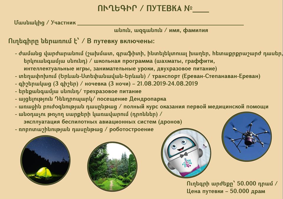 С 21 по 24 августа в Степанаване участники летней школы пройдут базовый курс выживания и оказания первой медицинской помощи в чрезвычайных ситуациях, будут заниматься эксплуатацией беспилотных авиационных систем (дронов) и роботостроением. Места ограничены.